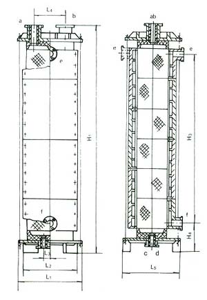 矩形块孔式石墨换热器是由若干数量的立方、矩形石墨换热块、上下石墨封头及其金属盖板和两侧金属侧盖等主要零件组成,各零件之间用衬垫密封,上下金属盖板和两侧盖板,用长拉杆螺栓连接与石墨块体紧固为一体。它具有结构简单、使用可靠、维修方便和优良的抗热冲击性、抗震动性。