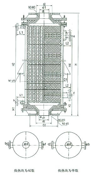 该系列采用聚四氟乙烯密封且加装压力弹簧作补偿装置。在石墨块上钻有两组不相通的流道,且这两组之间成直角,两种不同流体通过这两组流道达到热交换的目的。具有传热效率高、稳定可靠、抗冲击和检修方便等优点。换热面积可达800平方米。